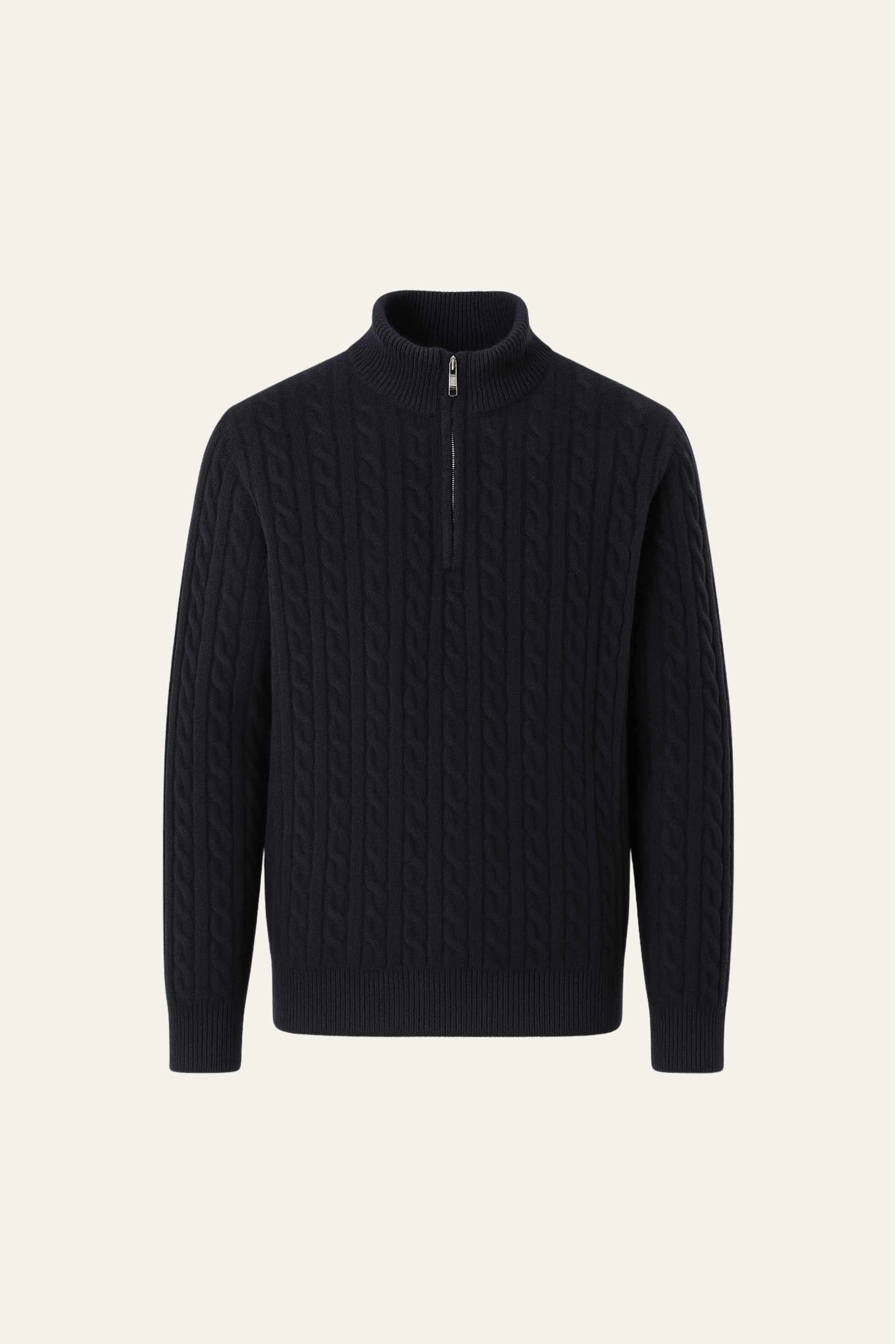 A half-zip sweater in a classic cable-knit pattern, crafted from luxurious cashmere for exceptional softness and warmth. The textured design adds depth while maintaining a refined, timeless silhouette. With its stand collar and polished half-zip closure, it transitions effortlessly from relaxed layering to elevated everyday wear.